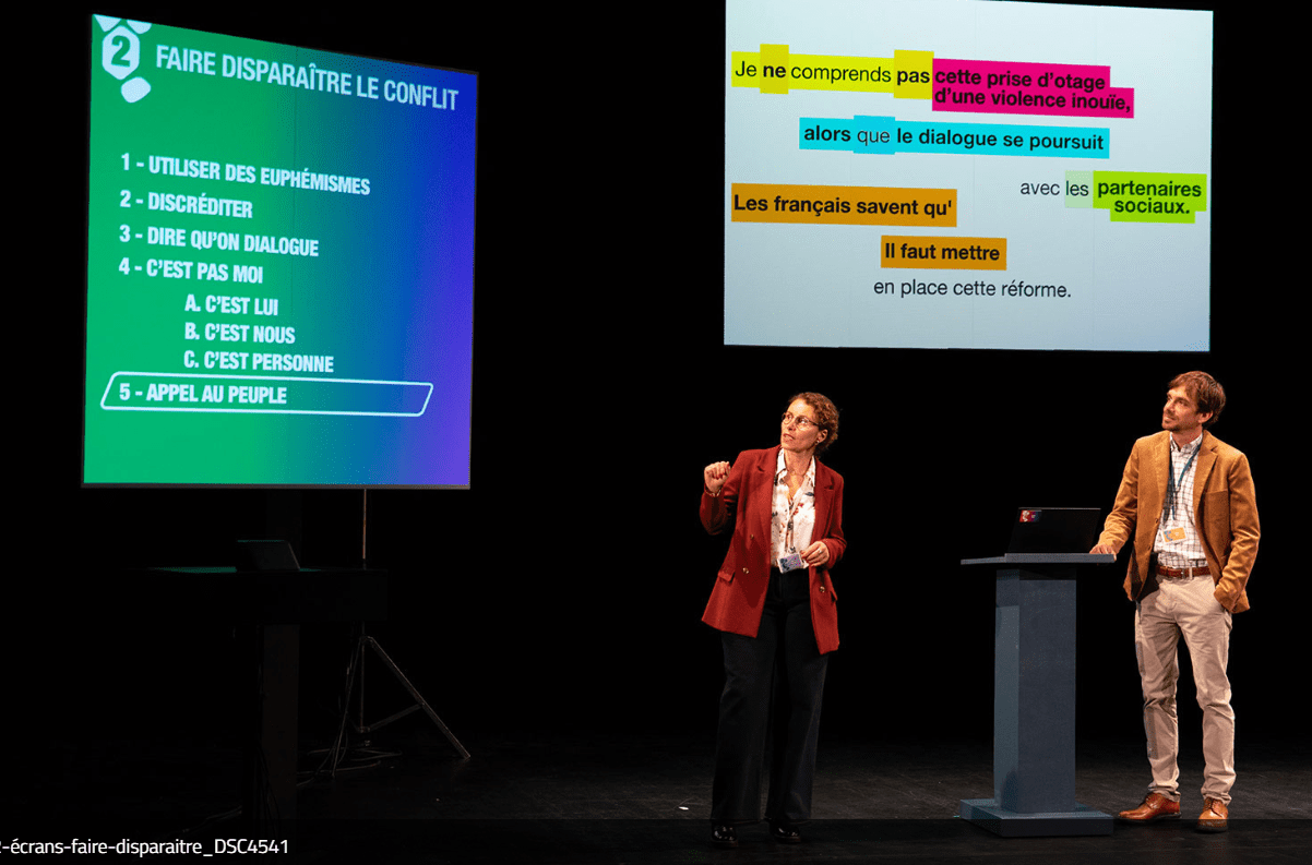 Deux conférenciers du GIRAFE, Groupe International de Recherche pour Automatiquement Fédérer les Electeurs, viennent présenter leurs travaux à un parterre de candidats à une élection. Ils ont mis au point une méthode qui permet d’emporter n’importe quel scrutin. Démonstration à l’appui, ils enseignent comment avoir toujours quelque chose à dire, comment faire disparaître le conflit, et, surtout, comment avoir toujours raison… Avec cette fausse conférence plus vraie que nature, Sébastien Valignat s’approprie des techniques discursives de propagande auxquelles nous sommes quotidiennement confrontés : travestissement des mots, sophismes, langue de bois. Mais si le rire l’emporte, la satire jette un froid. Les pirouettes de nos deux prestidigitateurs de la langue débusquent le développement exponentiel des méthodes de manipulation de masse au sein de notre société. Vers quel horizon tend la liberté si elle est vidée de la pensée ?